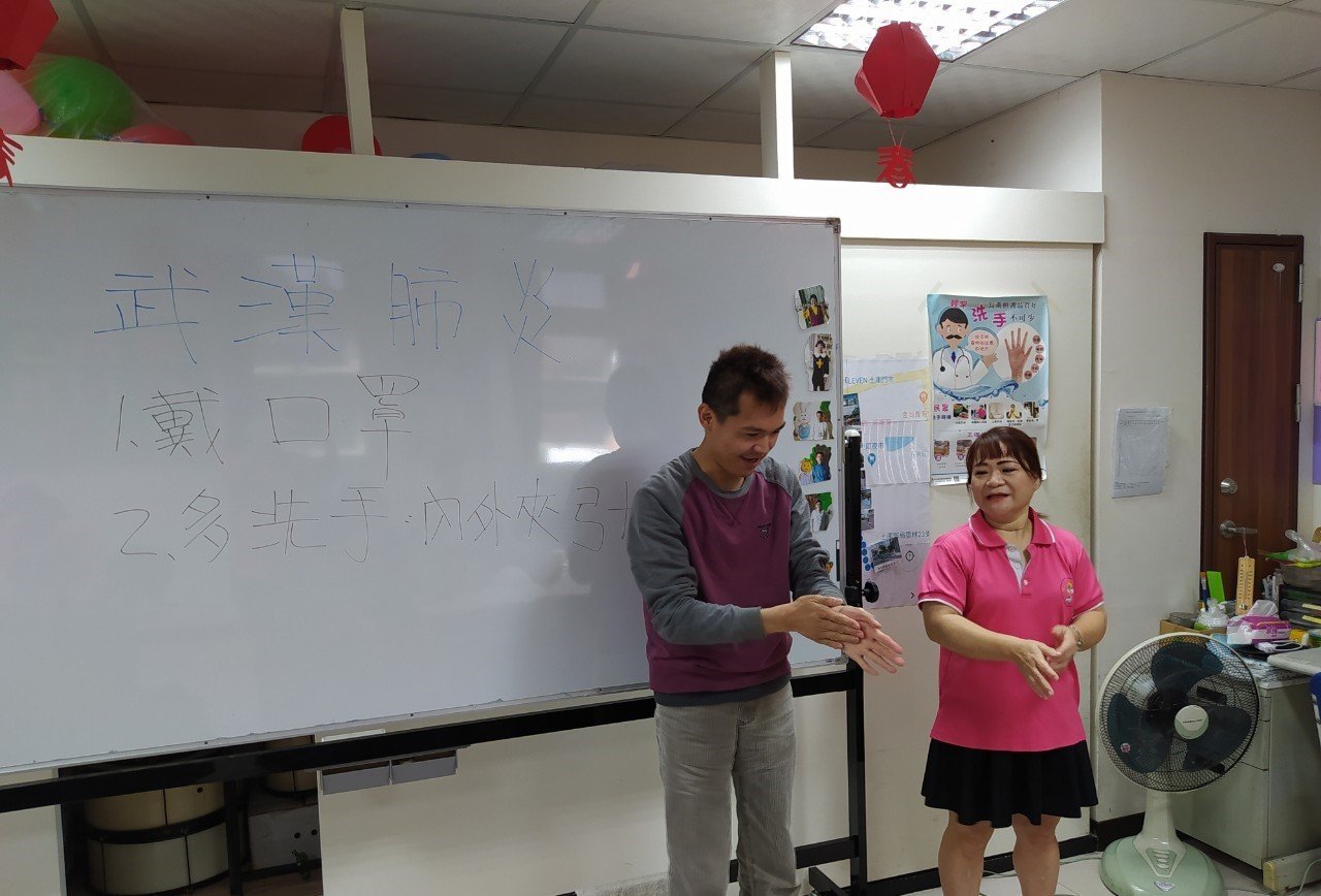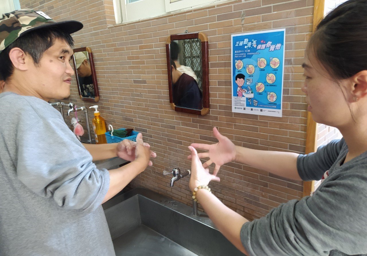 除此之外,中心教保老師也加強向服務對象宣導,讓服務對象了解為甚麼需要戴口罩,新型冠狀病毒是甚麼,若有身體不適感冒發燒應立即向工作人員反應。落實兩個小時帶服務對象洗手,加強教室教具的消毒清潔,盡力杜絕防疫破口。