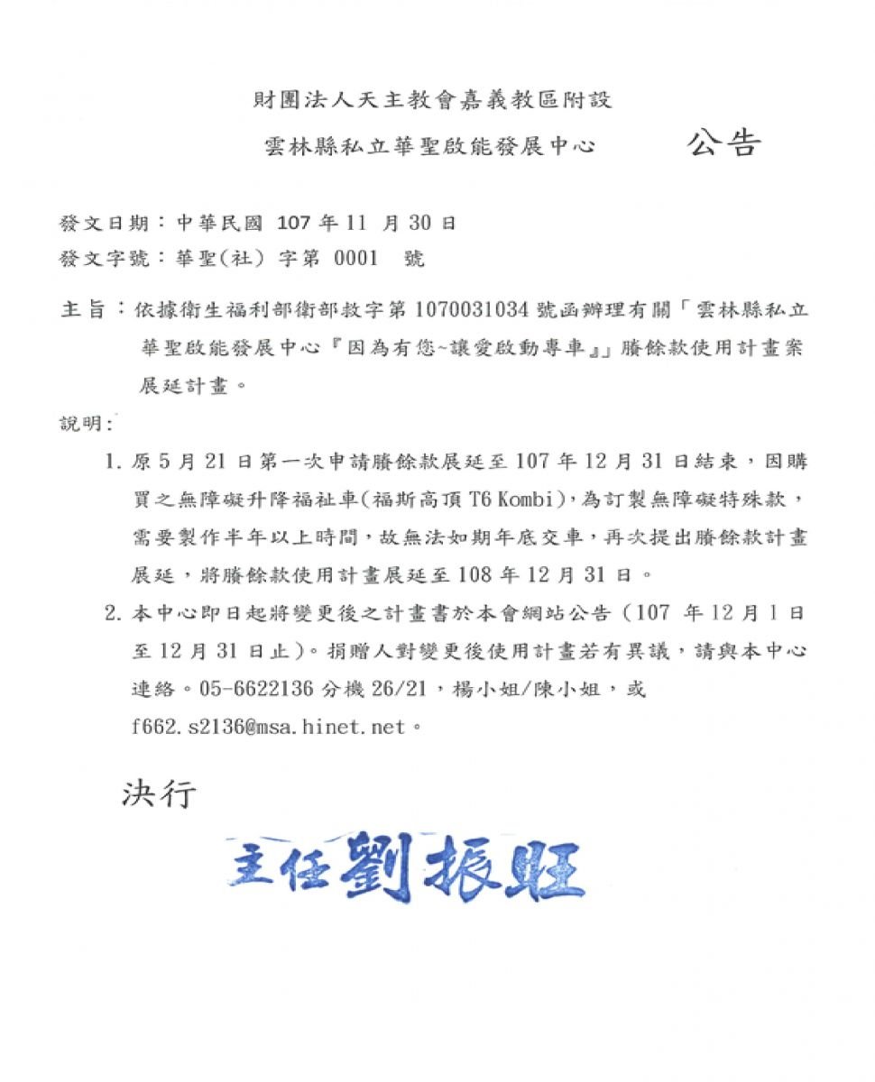 華聖啟能發展中心「因為有您~讓愛啟動專車」賸餘款使用計畫案展延計畫 【2018-11-30】