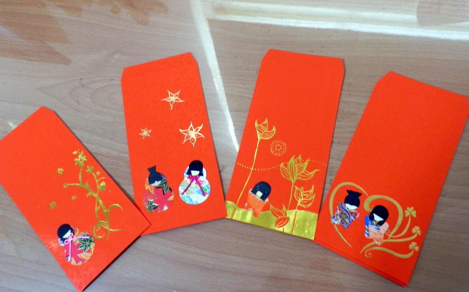 一點一滴純手工製作,將日本有禪紙、金花紙及其他紙,一張一張黏貼組合各自部位,將組合好的部位依序黏上,最後灑上美麗的亮粉,一步一步完成萬用紅包袋。