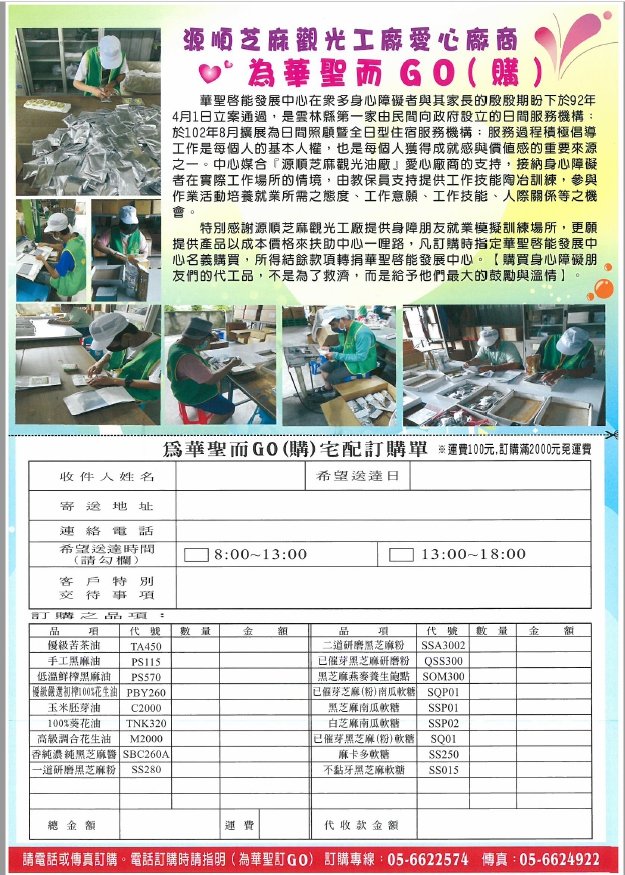 源順油廠為土庫在地企業,長期投入社會公益並幫助華聖家園,提供服務對象作業活動場所及作業活動訓練,使服務對象有機會以自己的努力獲得作業獎勵金,朝自立生活更進一步。在有限的資源裡,我們更感謝企業願意肯定家園服務,與家園合作推廣義賣活動。您的購買是支持社會友善企業,更是為家園內服務對象盡一份心力,因為有您的參與,讓世界更美好!!