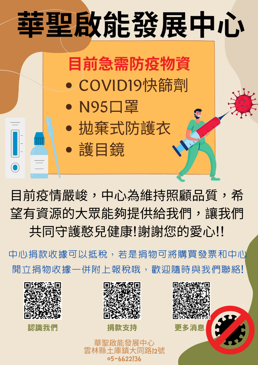 COVID19本土疫情持續升溫,中心為維持服務品質需要下列防疫物資,歡迎提供給我們
