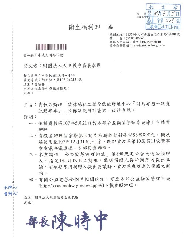 感謝這社會各界捐款幫助華聖的恩人,雲林縣私立華聖啟能發展中心「因為有您~讓愛啟動專車」活動,於107年3月12日結束,賸餘款為880,890元,因尚未使用完畢,將計畫展延至12月底及變更計畫書內容案:選擇購買一輛無障礙升降福祉車,特此公告。